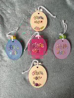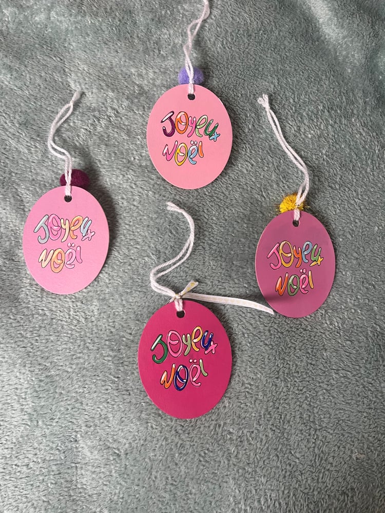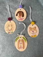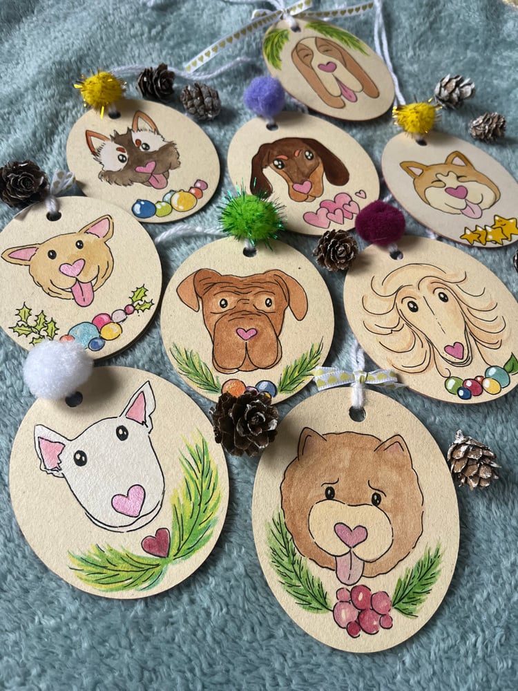 Chaque suspension est réalisée à la main, avec un portrait canin à l’aquarelle et un joyeux Noël inscrit au dos à l’acrylique.